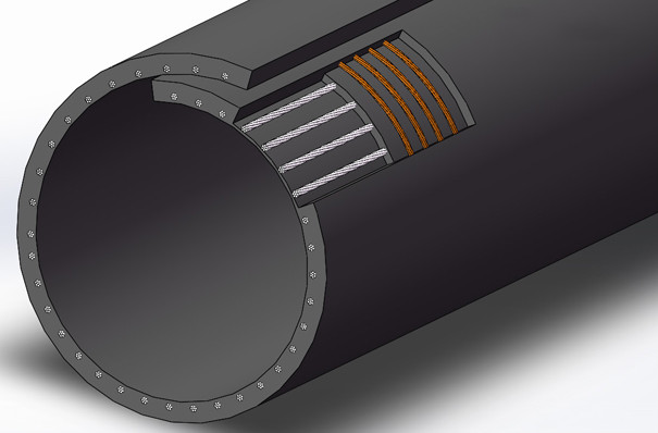 钢丝绳芯管状输送带是以钢丝绳作为芯体骨架,以高弹性、高耐磨、高强力橡胶为工作面组成的新型运输产品,主要用于输送粉状、颗粒状等易污染环境的物料。工作时胶带由平面渐变成U型,成为管状,将物料包住,实现封闭输送。
